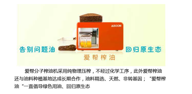 据悉小型家用榨油机的崛起,倍受广大消费都的青睐。家用榨油机的诞生让更多家庭通过自己动手来为家人压榨纯正植物油,彻底告别各类问题油。其中爱帮分子榨油机采用纯古法压榨,不含有任何添加成分,能最大限度的保留葵花籽中原有的亚油酸和维生素E等营养素,让老百姓吃上真正放心健康的食用油!放心油自己榨,自榨油选爱帮!
