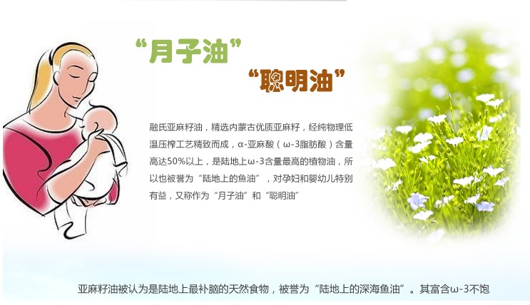 亚麻籽油对孕妇和婴幼儿特别有益,因此亚麻籽油也俗称月子油和聪明油。亚麻籽中不饱和脂肪酸中ω‐3系列(α‐亚麻酸)和ω‐6系列(γ-亚麻酸)之比接近(4-6):1,亚麻籽油含有18种氨基酸,经常摄入足量的α-亚麻酸还可有效防治高脂血症等心脑血管疾病,改善细胞携氧能力,软化血管,降低血管黏度,而且还具有抗癌,降血压,降血脂等。健康是每个家庭必须理智关注的问题,开展亚麻籽功能性食品的研究和开发工作刻不容缓,爱帮榨油为您提供专业、全面的质量服务,特在此提倡大家合理食用亚麻籽油。