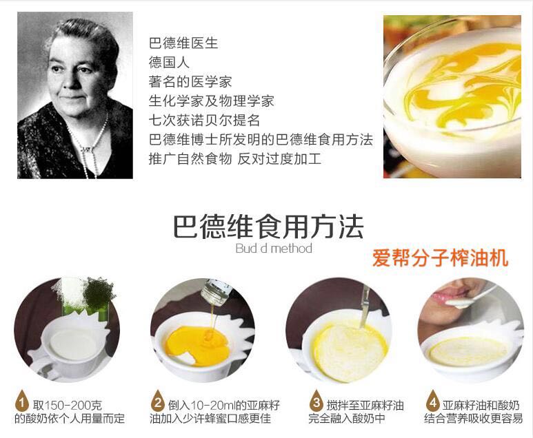 被称之为油脂先锋的巴德维博士早在几十年前推出好油疗法——亚麻油+酸奶,每日饮用是高血压、糖尿病、心脑血管等慢性疾病的有效食疗法。它的原理是亚麻籽油中的a—亚麻酸(ω—3脂肪酸)与奶酪中富含硫氨基酸的蛋白质化合物形成一种脂蛋白化合物,该化合物的双极性可以控制氧的吸收和释放:也就是说,在人体细胞不需要时,它可以吸收并储存多余的氧,在人体细胞需要时,供给细胞足够的氧。