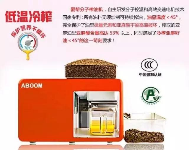 爱帮分子榨油机就是采用纯物理古法压榨,与其他榨油机相比最大优势是:所有油料无须炒制可持续榨油,油品温度<45°,完全保护了油里所有微量元素和亚麻酸不被高温破坏,榨取的亚麻油里亚麻酸含量高达53%以上。不经过化任何学工序,因此不含有任何的化学成分,最大限度的保留了原料中的营养成分,现榨现吃;油品经产品质量监督检验研究所检测完全符合国家一级食用油标准。